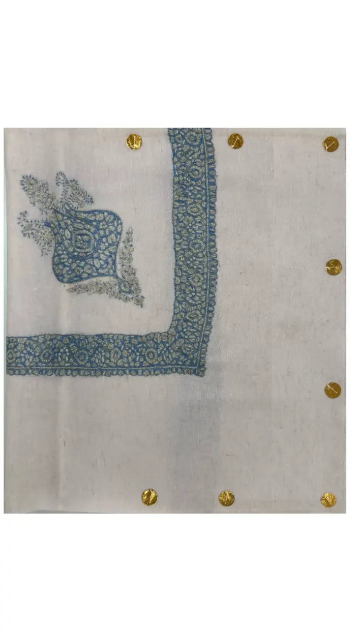 This is a Cashmere Pashmina keffiyeh measuring 54 inches by 54 inches. It features traditional hand embroidery in intricate floral and paisley motifs, using fine blue and grey threads on a soft ivory base. A luxurious blend of elegance and craftsmanship, perfect for formal or casual wear.